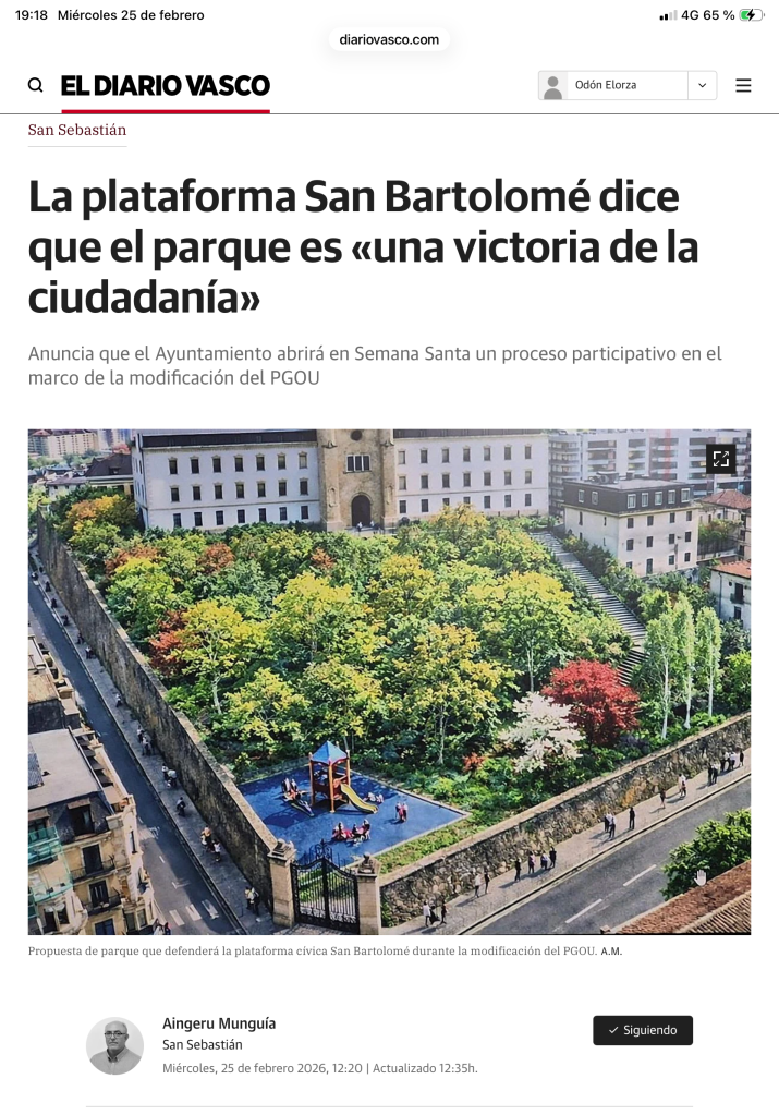 2. Ekainaren 14an, larunbatean, 12:00etatik aurrera, ekitaldi zibiko, ekologiko eta musikalean parte hartzea. San Bartolome gaineko terrazan izango da, hotelaren atarian eta Easo kaleko igogailutik sartuz. Horrela, 2026an Parkea errealitate bihurtzea eskatu nahi dugu. Hurrengo posta elektroniko batean jakinaraziko dizkizugu xehetasun guztiak.