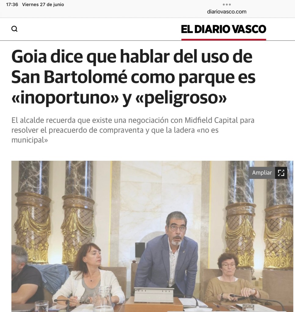Salimos decepcionados del último Pleno, tras el voto en contra del alcalde Goia, junto al PNV y PSOE, a la Moción que pedía expresar, simplemente, la voluntad municipal de destinar a un Parque público accesible la ladera de San Bartolomé.