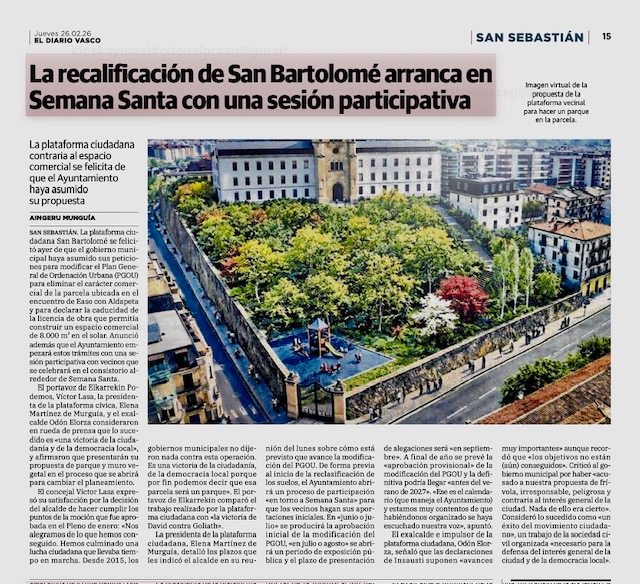 Hace solo 10 meses un fondo de inversión tenia una Licencia de obras y el Ayuntamiento, con la excepción Elkarrekin Podemos, justificaba y apoyaba, sin dudas, una operación nefasta desde un punto de vista medioambiental, de respeto a la Memoria de la ciudad, del pequeño comercio y de la calidad de vida de los vecinos de la zona. Una operación especulativa que durante 11 años nos repitieron que era buena e intocable.